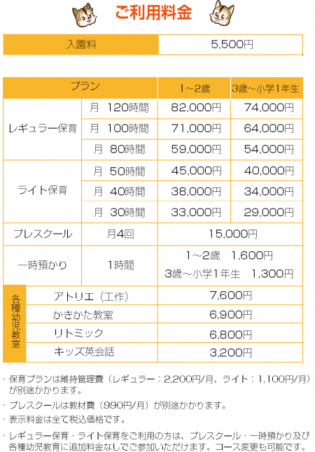 ★月極保育(月謝制)の方はプレスクール・幼児教室(アトリエ・かきかた教室・リトミック・キッズ英会話)に追加料金無しでご参加頂けます。